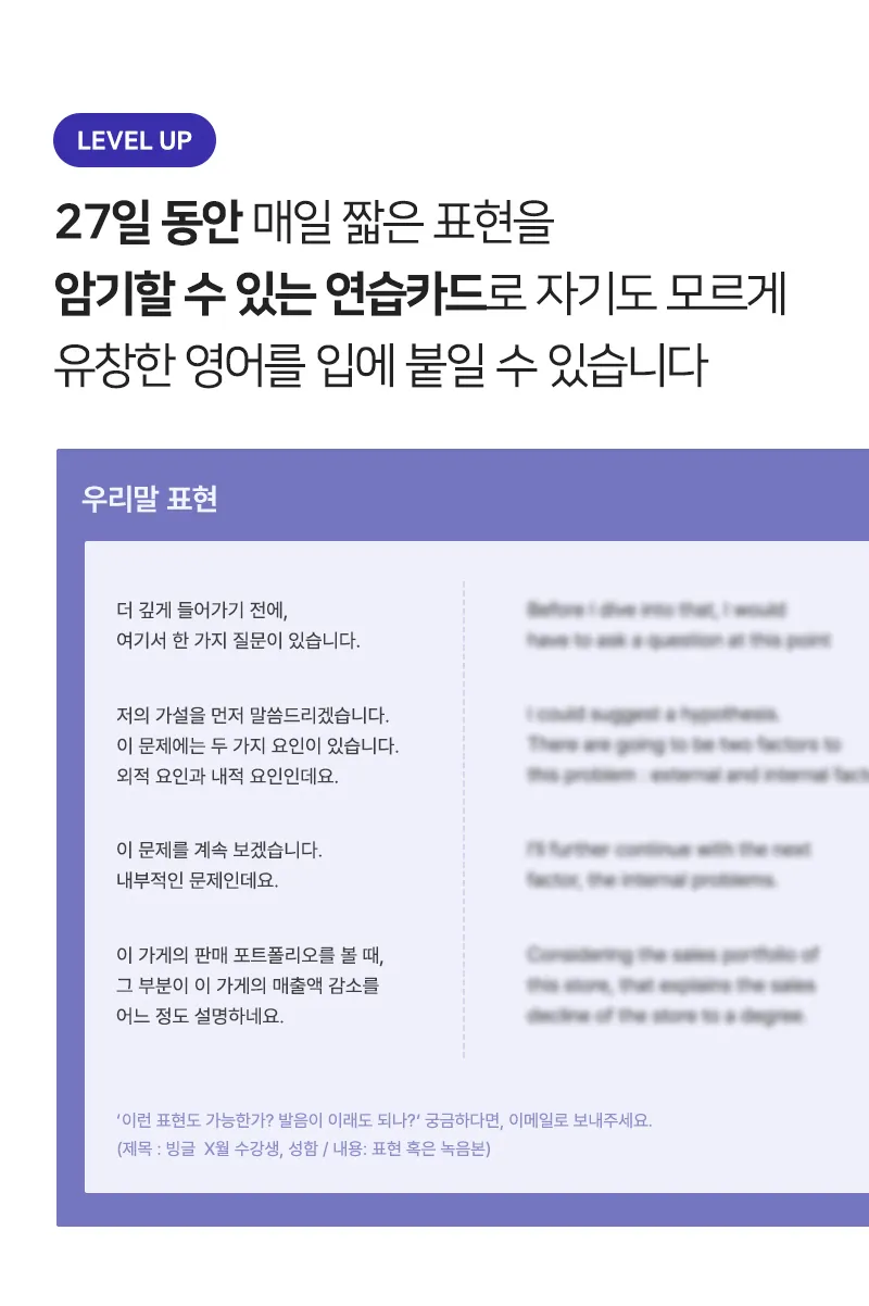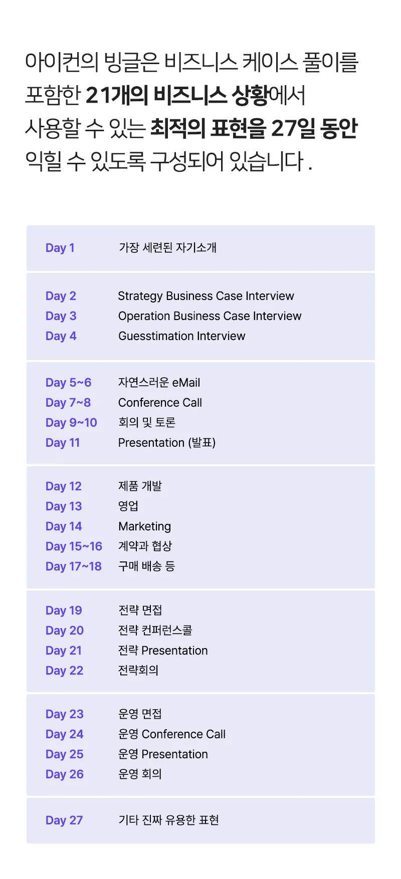 빙글 영어를 15분씩, 27일간 연습하는 코스로 구성했습니다.