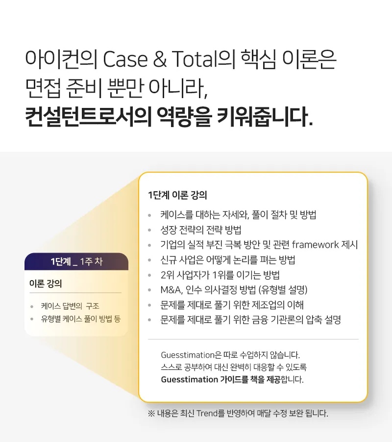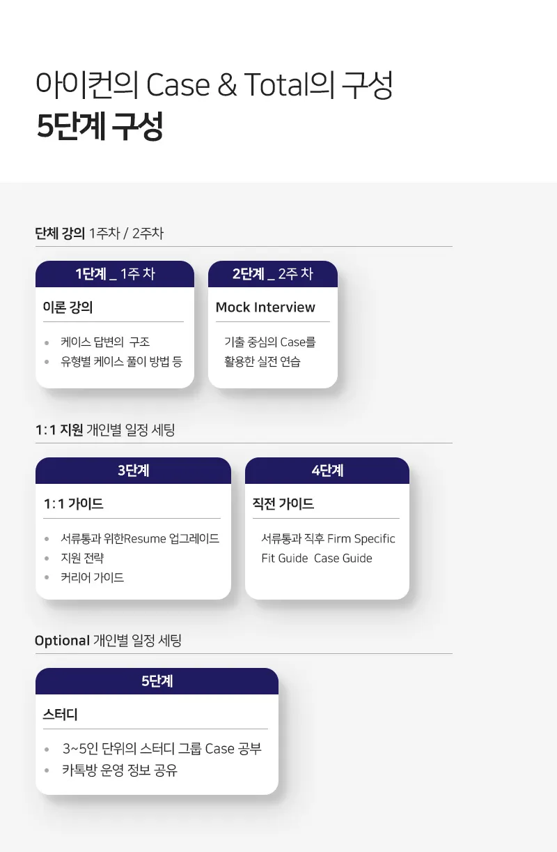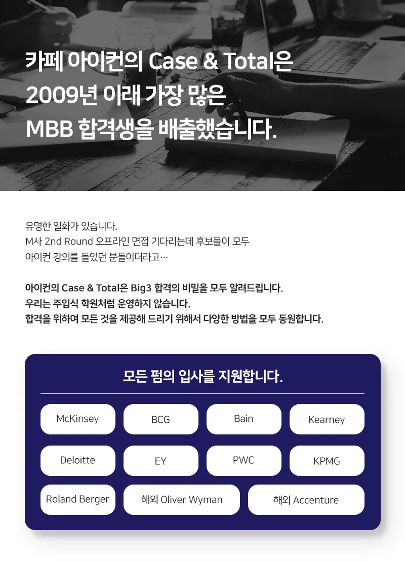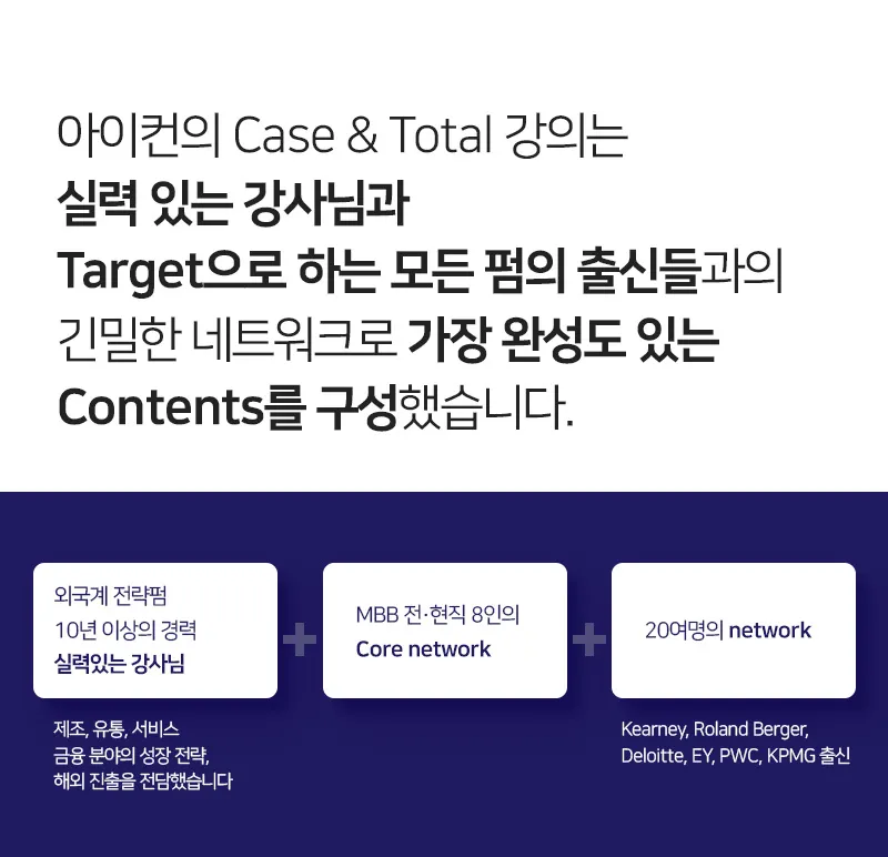 맥킨지, BCG, Bain, 커니를 비롯한 한국의 경영 컨설팅 펌에 입사하기 위해서는 Case & Total이라는 강의를 듣는 것이 가장 비용효과 적입니다. Case & Total은 시장에서가장 유명하며, 가장 많은 문제 Pool, case 풀이 방법, Fit 가이드, 커리어 가이드, 그리고 경력자의 헤드헌터를 통한 취업까지 모두 커버하는 유일한 강의입니다.