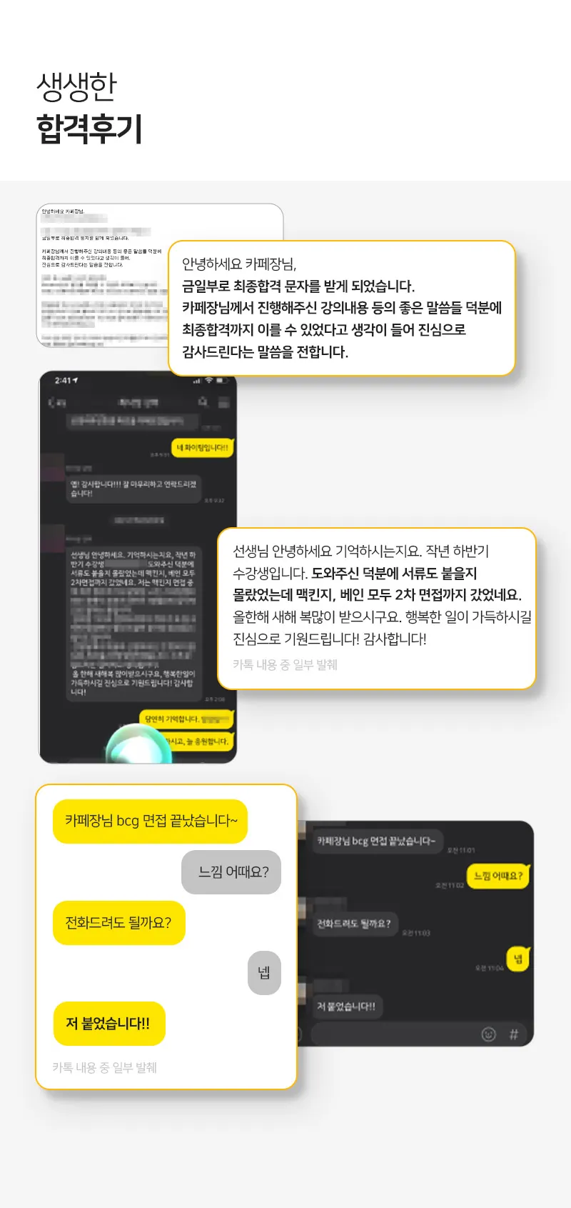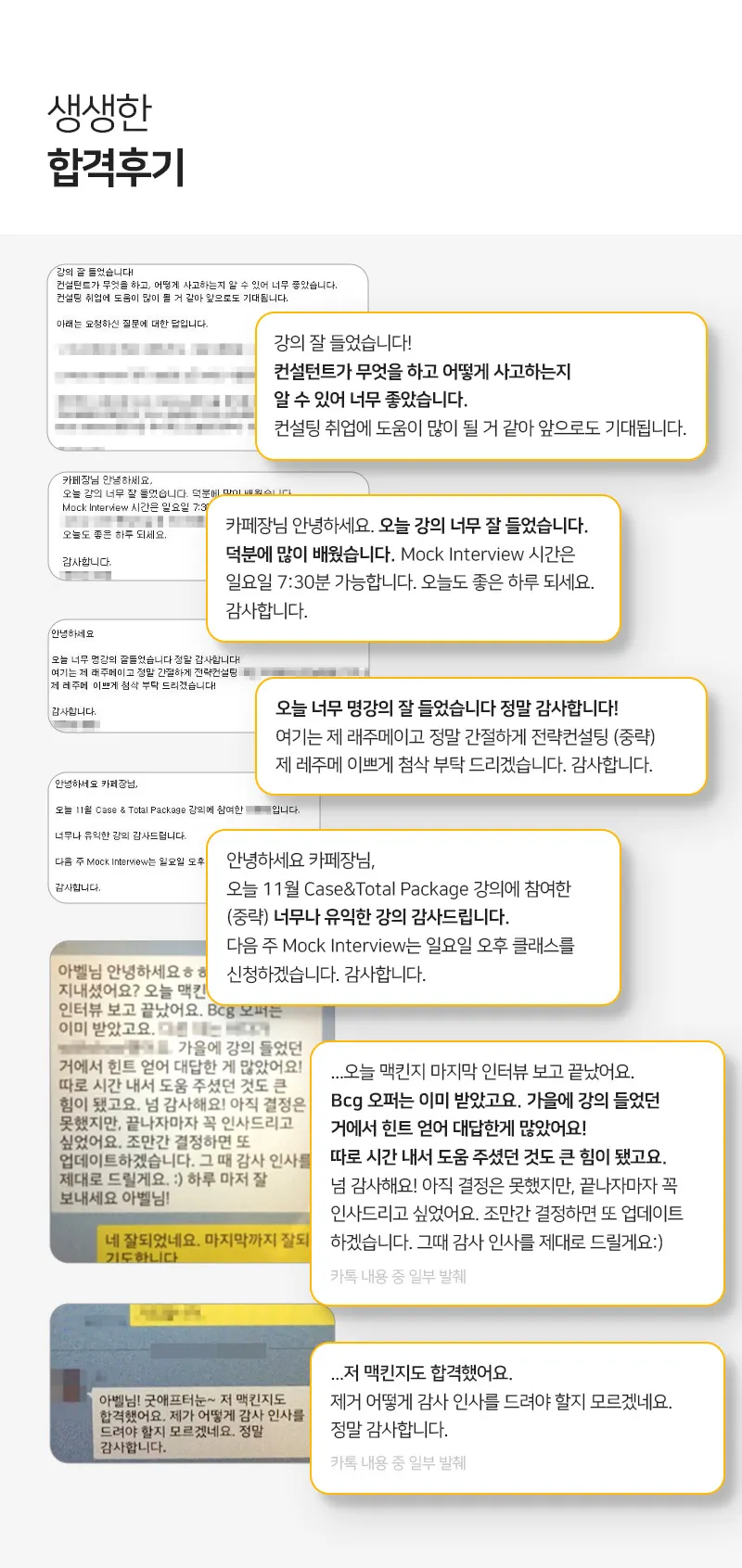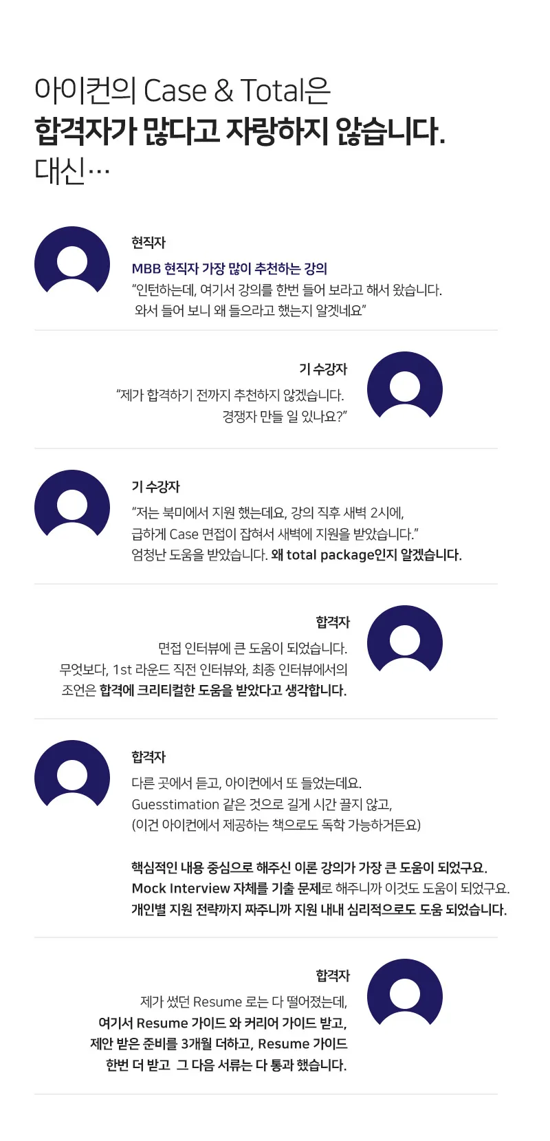 이 강의는 맥킨지, BCG, Bain과 같은 MBB 입사를 위해 필수적인 강의입니다. 동시에 PWC, Deloitte, Kearney, KPMG, RB 입사를 위한 뛰어난 인사이트를 제공합니다. 전체 커리큘럼 역시 체계적이고, 합격률이 높습니다. 저 역시 그 산 증인입니다. ^^ 이미 많은 합격자들에게 검증된 강의이며, 수많은 사례 풀이와 풍부한 경험을 기반으로 한 가이드를 통해 취업에 성공하는 데 도움을 줄 것입니다.